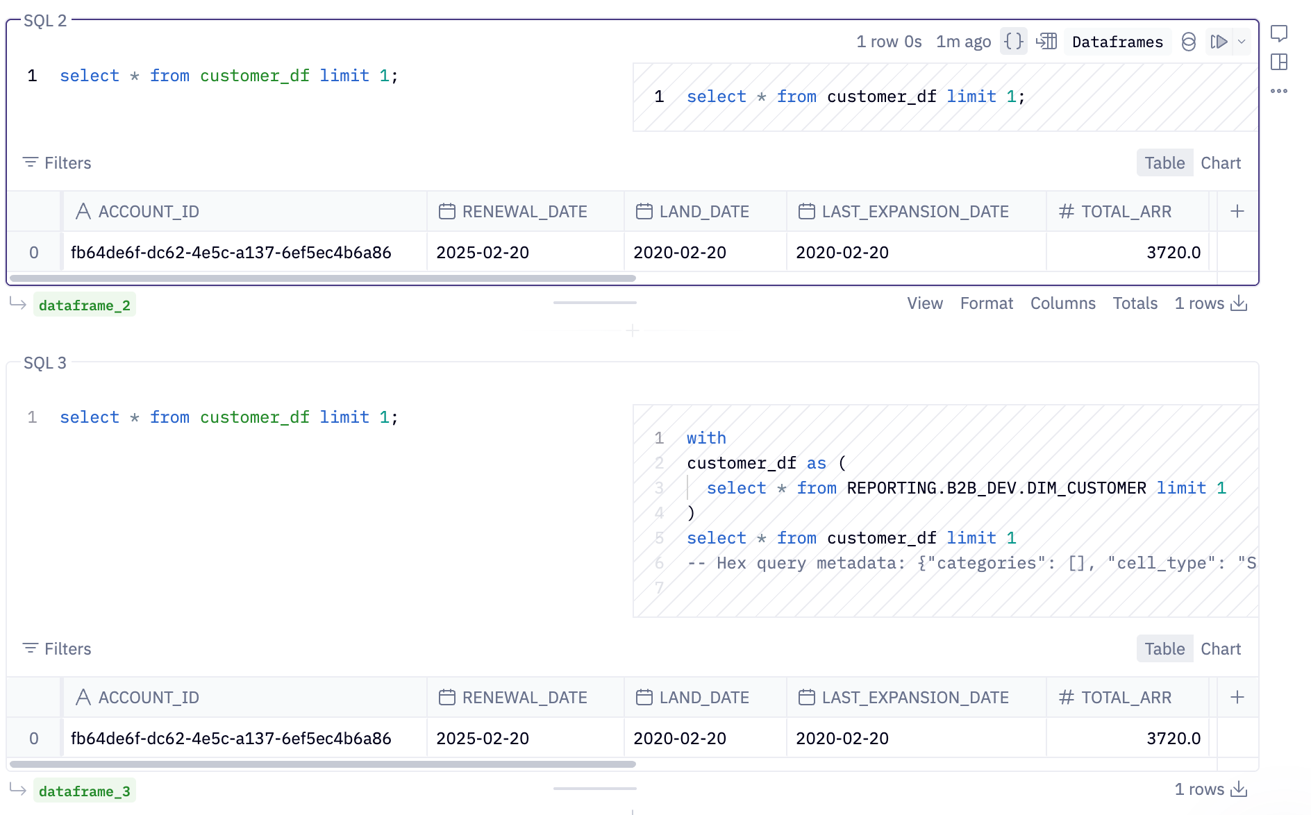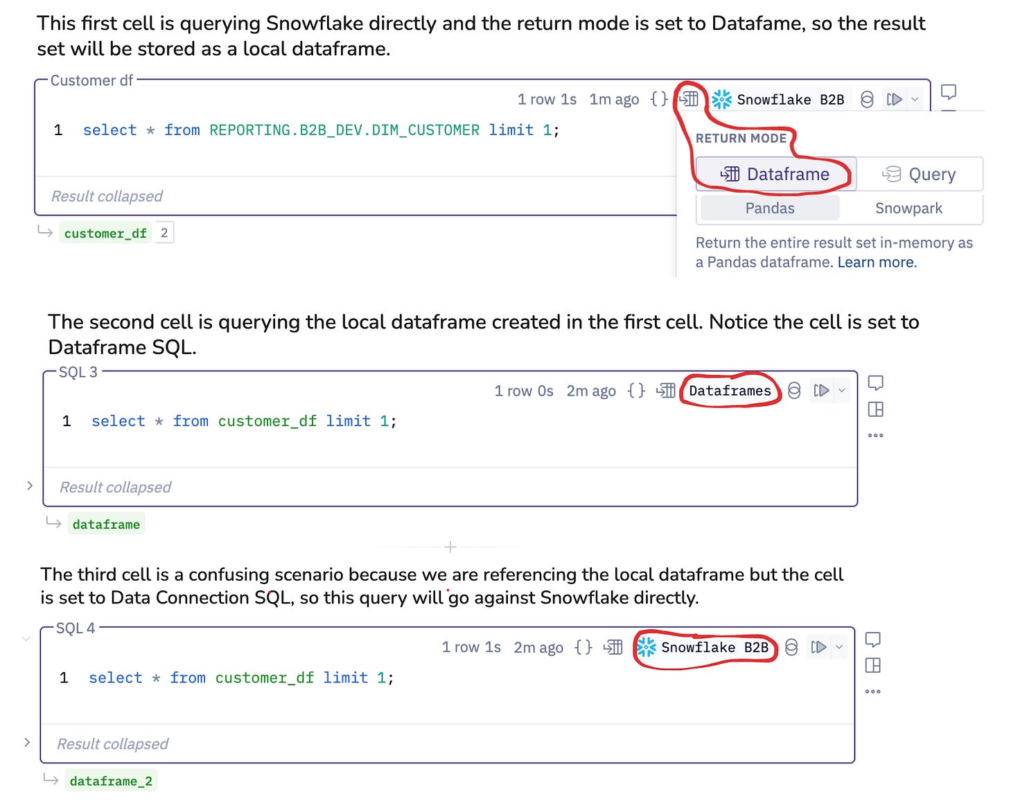 Chaining SQL allows you to go back and forth between writing SQL against the in-memory dataframe (Dataframe SQL) and the warehouse (Data Connection SQL). Below is an example of workflow where it looks like the third cell should be querying a local dataframe, but it is actually sending a query directly to Snowflake.