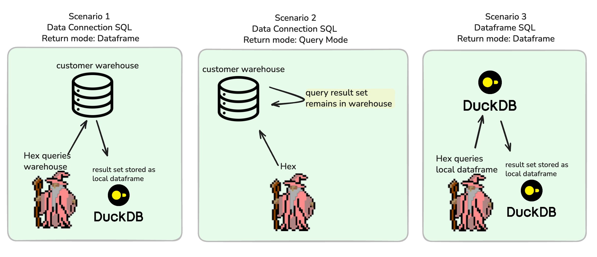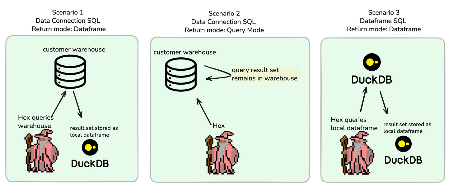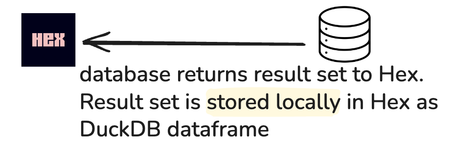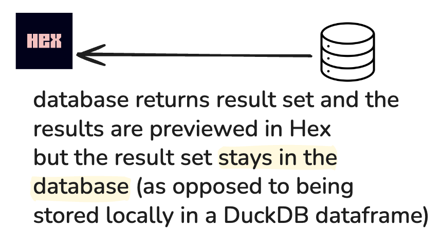 We’ve covered Return modes — which told us how/where the query results are being stored. Now' let’s talk about the difference between Hex querying the database/warehouse vs local dataframes (DuckDB).