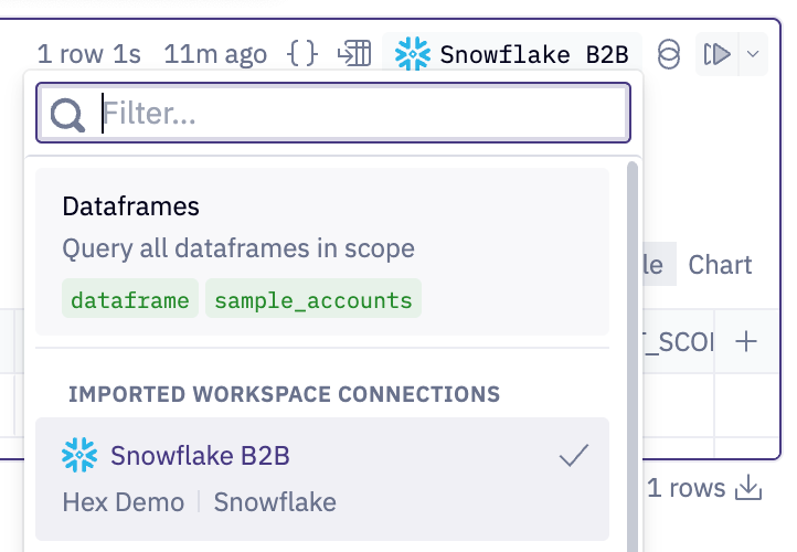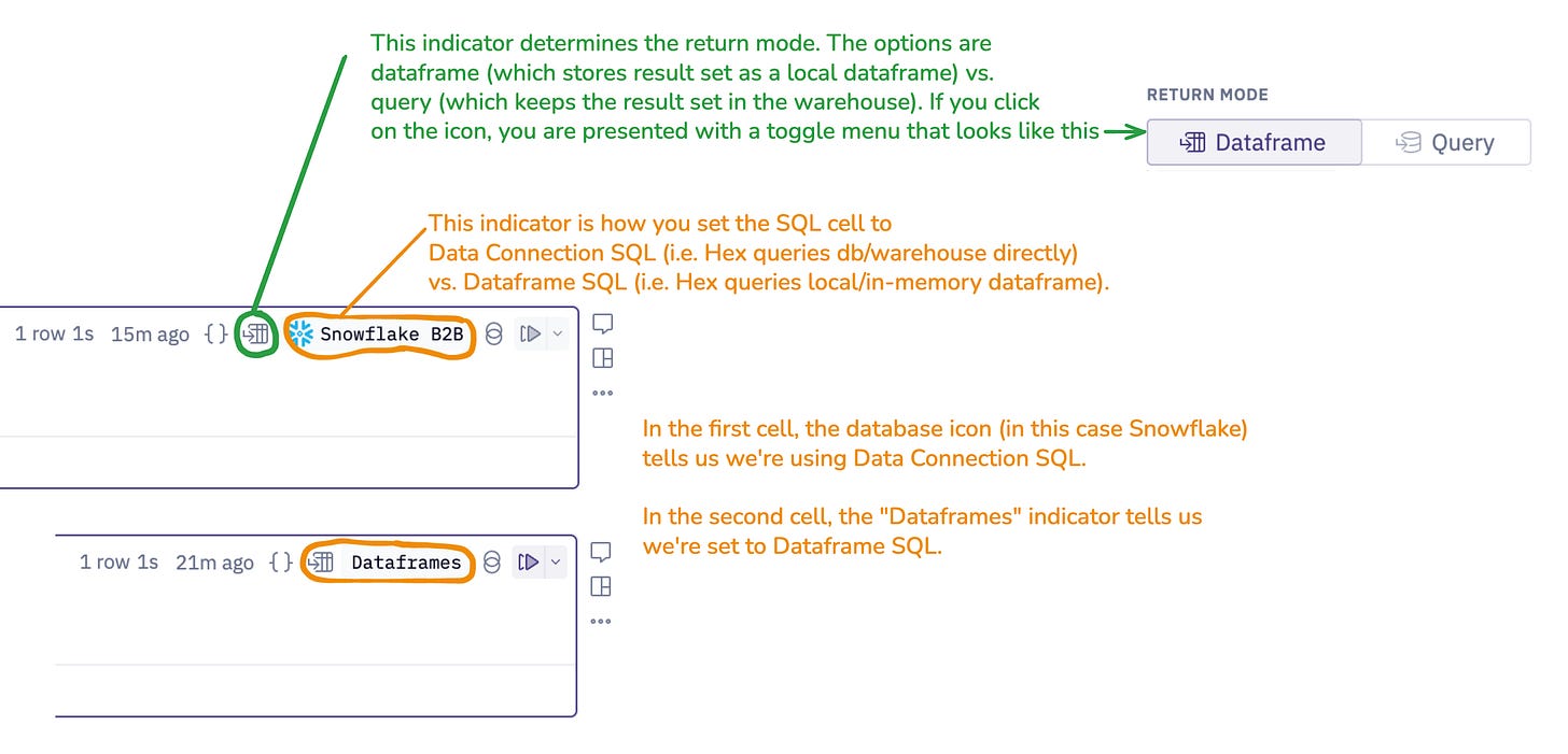 Data connection SQL vs Dataframe SQL — this refers to whether Hex is sending a query to your database/warehouse or whether Hex is querying an in-memory dataframe.