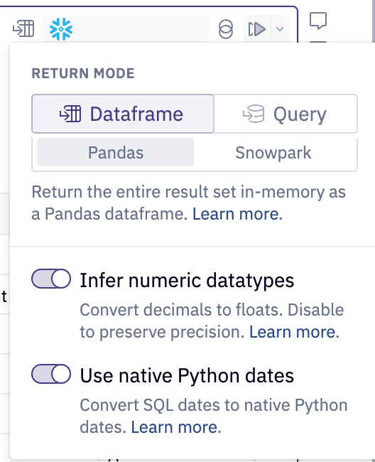 Dataframe SQL means Hex is sending a query to the in-memory Duckdb dataframe. As a result, the return mode will always be dataframe, since there is no interaction with a warehouse in this scenario.